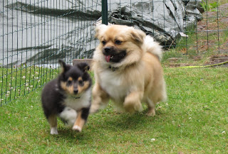Tepi ja Luna on hauska parivaljakko. Ikäeroa ei tosiaan ole kuin viikkoja, ja korkeus on nyt lähes sama - toisella on vain vähän pidemmät jalat kuin toisella :) Mukavaa, kun on samankokoinen leikkikaveri olemassa. Jakkekin oli oikein mukavaa seuraa, kun haistelultaan malttoi keskittyä leikkimiseen - hormonit hyrrää jo melkein vuoden vanhalla kaverilla :)
